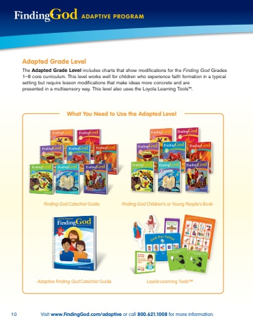 Our Response to God%u2019s GiftsADAPTIVE PROGRAM10 Visit www.FindingGod.com/adaptive or call 800.621.1008 for more information.Finding God Catechist GuideAdaptive Finding God Catechist GuideFinding God Children%u2019s or Young People%u2019s BookLoyola Learning Tools%u2122Adapted Grade LevelThe Adapted Grade Level includes charts that show modifications for the Finding God Grades 1%u20138 core curriculum. This level works well for children who experience faith formation in a typical setting but require lesson modifications that make ideas more concrete and arepresented in a multisensory way. This level also uses the Loyola Learning Tools%u2122. What You Need to Use the Adapted Level