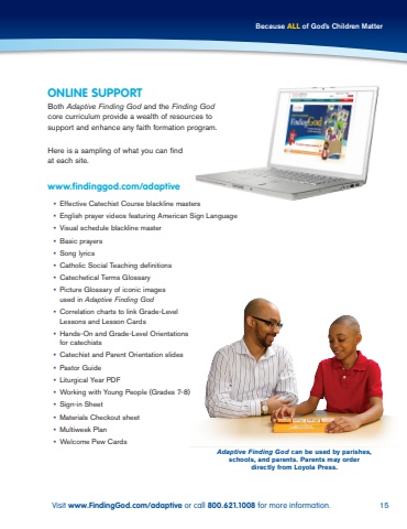 Visit www.FindingGod.com/adaptive or call 800.621.1008 for more information. 15Because ALL of God%u2019s Children MatterONLINE SUPPORTBoth Adaptive Finding God and the Finding Godcore curriculum provide a wealth of resources to support and enhance any faith formation program.Here is a sampling of what you can find at each site. www.findinggod.com/adaptive%u2022 Effective Catechist Course blackline masters%u2022 English prayer videos featuring American Sign Language%u2022 Visual schedule blackline master%u2022 Basic prayers%u2022 Song lyrics%u2022 Catholic Social Teaching definitions%u2022 Catechetical Terms Glossary%u2022 Picture Glossary of iconic images used in Adaptive Finding God%u2022 Correlation charts to link Grade-Level Lessons and Lesson Cards%u2022 Hands-On and Grade-Level Orientations for catechists%u2022 Catechist and Parent Orientation slides%u2022 Pastor Guide%u2022 Liturgical Year PDF%u2022 Working with Young People (Grades 7-8)%u2022 Sign-in Sheet%u2022 Materials Checkout sheet%u2022 Multiweek Plan%u2022 Welcome Pew CardsAdaptive Finding God can be used by parishes, schools, and parents. Parents may order directly from Loyola Press.