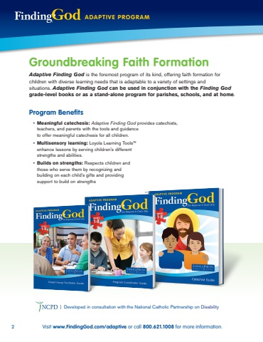 2 Visit www.FindingGod.com/adaptive or call 800.621.1008 for more information.Our Response to God%u2019s GiftsADAPTIVE PROGRAMGroundbreaking Faith Formation Adaptive Finding God is the foremost program of its kind, offering faith formation for children with diverse learning needs that is adaptable to a variety of settings andsituations. Adaptive Finding God can be used in conjunction with the Finding Godgrade-level books or as a stand-alone program for parishes, schools, and at home.Program Benefits%u2022 Meaningful catechesis: Adaptive Finding God provides catechists, teachers, and parents with the tools and guidance to offer meaningful catechesis for all children. %u2022 Multisensory learning: Loyola Learning Tools%u2122 enhance lessons by serving children%u2019s different strengths and abilities.%u2022 Builds on strengths: Respects children and those who serve them by recognizing and building on each child%u2019s gifts and providing support to build on strengths| Developed in consultation with the National Catholic Partnership on Disability