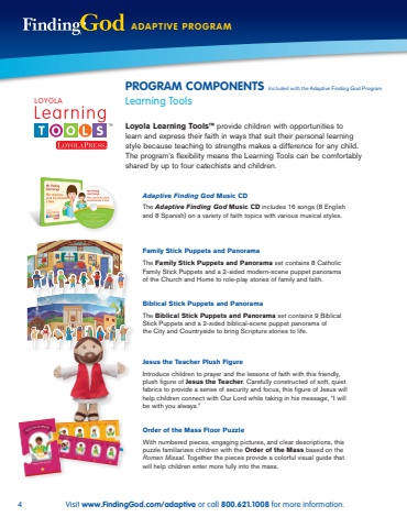 4 Visit www.FindingGod.com/adaptive or call 800.621.1008 for more information.Our Response to God%u2019s GiftsADAPTIVE PROGRAMPROGRAM COMPONENTS Included with the Adaptive Finding God ProgramLearning ToolsLoyola Learning Tools%u2122 provide children with opportunities to learn and express their faith in ways that suit their personal learning style because teaching to strengths makes a difference for any child. The program%u2019s flexibility means the Learning Tools can be comfortably shared by up to four catechists and children.Adaptive Finding God Music CDThe Adaptive Finding God Music CD includes 16 songs (8 English and 8 Spanish) on a variety of faith topics with various musical styles.Family Stick Puppets and PanoramaThe Family Stick Puppets and Panorama set contains 8 Catholic Family Stick Puppets and a 2-sided modern-scene puppet panorama of the Church and Home to role-play stories of family and faith.Biblical Stick Puppets and PanoramaThe Biblical Stick Puppets and Panorama set contains 9 Biblical Stick Puppets and a 2-sided biblical-scene puppet panorama of the City and Countryside to bring Scripture stories to life.Jesus the Teacher Plush FigureIntroduce children to prayer and the lessons of faith with this friendly, plush figure of Jesus the Teacher. Carefully constructed of soft, quiet fabrics to provide a sense of security and focus, this figure of Jesus will help children connect with Our Lord while taking in his message, %u201cI will be with you always.%u201dOrder of the Mass Floor PuzzleWith numbered pieces, engaging pictures, and clear descriptions, this puzzle familiarizes children with the Order of the Mass based on the Roman Missal. Together the pieces provide a colorful visual guide that will help children enter more fully into the mass. LOYOLAOYOLA