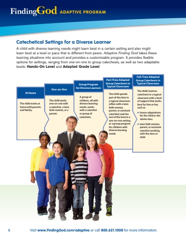 6 Visit www.FindingGod.com/adaptive or call 800.621.1008 for more information.Our Response to God%u2019s GiftsADAPTIVE PROGRAMFull-Time Adapted Group Catechesis in Typical ClassroomAt HomeOne-on-OneGroup Program for Diverse LearnersPart-Time Adapted Group Catechesis in Typical ClassroomThe child works at home with parents and family.The child works one-on-one with a catechist, a teen faith mentor, or a parent. A group of children, all with diverse learning needs, works with a catechist or group of catechists. The child spends part of the time in a typical classroom (often with a teen faith mentor, parent, or assistant catechist) and the rest of the time in a one-on-one setting or a group program for children with diverse learning needs.The child receives catechesis in a typical classroom with a level of support that works best for him or her, such as%u25b6 lesson adaptations for the child or the whole class%u25b6 teen faith mentor, parent, or assistant catechist working with the class or childCatechetical Settings for a Diverse LearnerA child with diverse learning needs might learn best in a certain setting and also might learn best at a level or pace that is different from peers. Adaptive Finding God takes these learning situations into account and provides a customizable program. It provides flexible options for settings, ranging from one-on-one to group catechesis, as well as two adaptable levels: Hands-On Level and Adapted Grade Level.