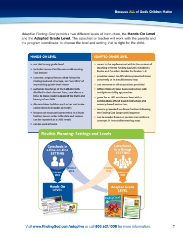 Visit www.FindingGod.com/adaptive or call 800.621.1008 for more information. 7Because ALL of God%u2019s Children MatterAdaptive Finding God provides two different levels of instruction, the Hands-On Leveland the Adapted Grade Level. The catechist or teacher will work with the parents and the program coordinator to choose the level and setting that is right for the child.HANDS-ON LEVEL ADAPTED GRADE LEVEL%u25b6 not tied to any grade level%u25b6 includes Lesson Card lessons and Learning Tool lessons%u25b6 concrete, original lessons that follow the Finding God unit structure, not %u201cretrofits%u201d of any existing grade-level lesson%u25b6 authentic teachings of the Catholic faith distilled in their clearest form, one idea at a time, to make readily apparent the truth and beauty of our faith%u25b6 discrete ideas build on each other and make connections to broader concepts%u25b6 lessons not necessarily presented in a linear fashion; lesson order is flexible and lessons can be repeated as a child needs%u25b6 can be used at home%u25b6 meant to be implemented within the context of teaching with the Finding God 2013 Children%u2019s Books and Catechist Guides for Grades 1%u20138 %u25b6 provides lesson modifications presented more concretely or in a multisensory way%u25b6 can use some or all adaptations provided%u25b6 differentiates typical book instruction with multiple-modality approaches%u25b6 great for a child who learns best with a combination of text-based instruction and sensory-based instruction%u25b6 lessons presented in a linear fashion following the Finding God Scope and Sequence%u25b6 can be used at home so parents can reinforce concepts in new and interesting waysFlexible Planning: Settings and LevelsCatechesis in a One-on-One SETTINGHands-OnLEVELUNIT 1 God, Our Creator and Father 1AInvite the parents to look out a window at home with their child twice during the week. Encourage them to remind their child that God creates the earth and the sky.At Home%u25b6 Picture Glossary* image for God%u25b6 window crayons%u25b6 photocopy of Side B of this Lesson Card%u25b6 crayons or markers%u25b6 access to a window%u25b6 Learning Tool: Picture Cards 3, 4, and 8*Pages 445%u2013451 of the Adaptive Finding God Catechist GuideWhat You NeedGod creates the earth and the sky. He creates everything in the world.ConceptExampleLesson Steps1 Opening PrayerPray the Sign of the Cross with the child, followed by: Dear God, you are our Creator and Father. You create the earth and the sky. Guide us in remembering that you create the whole world for us. Pray the Sign of the Cross.2 Begin with Life ExperienceShow the child the image for God from the Picture Glossary. Explain that God creates things because he loves us. Display the Picture Cards. Say: God creates flowers. Which is a picture of a flower? Then say: God creates trees. Which is a picture of a tree? Next say: God creates clouds. Which is a picture of clouds? Tell the child that God also creates the earth and the sky. Say: The earth is the ground we stand on. The sky is what we see when we look up. God creates both of these. 3 ConnectGo to the window. Using window crayons, draw and label what you see or have the child add birds to the sky and trees to the ground. Explain that God creates all these things. Invite the child to identify the earth and sky from the photocopy of Side B of this card. Next, help the child color then cut out the puzzle pieces. Put the puzzle together. Say: God creates everything we can see when looking out a window. He creates the earth and sky. 4 Closing PrayerPray the Sign of the Cross with the child, followed by: Thank you, God, for creating the earth and the sky. Conclude by praying the Sign of the Cross.God Creates the Earth and the SkyActivity: The child makes a puzzle showing that God creates the earth and the sky.Adaptive Finding God Hands-On Lesson Cards %u00a9 A4017_ALK_FG_LC_U1_S1.indd ~ pg 3 ~ LoyolaPress. 6/19/14 7:24 PMPDF Signoff: Production _______ Design _______ Editorial _______Catechesis in a Group SETTINGAdapted GradeLEVELSESSION11 Engage Unit OpenerFollow the steps on page 1 of the Grade Level Catechist Guide. Read pages 1%u20132 with the child.General Directions for Completing Page 3 of a Grade-Level BookModify the Set the Stage and Get Started steps on page 3 of the Grade- Level Catechist Guide. You may use the pictures from the original lesson, some of the original lesson directions, or all of the original lesson directions. Or you may simply use the modification or learning tool idea in the chart below.Grade Level Possible Modification for Use with Page 31 Gather fresh flowers. Help the child make a flower arrangement in a vase. Say: God creates flowers. God creates you and me. In this session, we%u2019ll learn about all the things God creates.2 In advance, make an I Love You Card described on page 3 under If Time Allows. Help the child give the card to a friend in the room. Say: we will learn what God creates and why he creates those things. We make cards for people we love. In this session 3 CATHOLIC FAMILY STICK PUPPETSstick puppet and hold it near objects of God%u2019s creation that he or she likes. Talk about the Go outside. Have the child walk around with a need to care for God%u2019s creation. Say: In this session we will learn about the wonders of God%u2019s creation and how we are called to take care of it.4 Go outside to work together on God%u2019s creation, such as pulling weeds, picking up trash, or watering plants. Say: In this session we will learn about the wonders of God%u2019s creation and how we need to take care of it.5 GOD%u2019S CREATION PICTURE CARDSpictures of his or her favorite things. Together look online for additional pictures of God%u2019s Have the child look through the cards and choose creation and print them out. Say: God created everything in the world, including your favorite things. In this session we will learn to be thankful for all of what God creates.6 Ask the chil