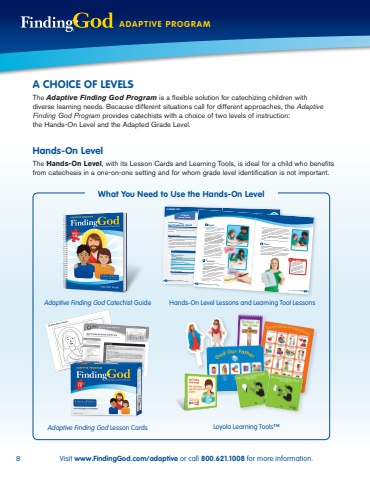 8 Visit www.FindingGod.com/adaptive or call 800.621.1008 for more information.45-Minute Lesson PlannerPrayerIn this lesson, you and the child pray a short opening prayer of petition and close with a brief prayer of thanks. These prayers help the child appreciate and be aware of God%u2019s creation. What You NeedRequired%u25b6 art supplies%u25b6 magazines%u25b6 Learning Tool: Picture Cards 1%u201312%u25b6 six 3 x 5 inch note cardsYour Creative Side%u25b6 images of tools or ingredients and the things they are used to makeSTEPS APPROXIMATE TIMEAdjust timing for%u00a0child.Begin%u2022 Review the previous lesson.%u2022 Pray the opening prayer.%u2022 Begin with life experience: Draw things that God creates. 15 minutesConnectLearn about God%u2019s creation: Picture Cards 1%u201312. 20 minutesClosePicture Update, Closing Prayer, and Transition for Home 10 minutesAfter This Lesson%u25b6 If you feel that the child has a good understanding that God creates everything, move on to the Lesson Cards for the next session.LEARNING TOOL LESSON 1God Creates the WorldConcept: God is the Creator of everything. God creates the earth, the sky, and the seas. God creates animals, plants, and people.Before This Lesson%u25b6 Complete at least one Lesson Card from Session 1.%u25b6 Review the rules and procedures that you%u2019ve established for the child. See the Effective Catechist section for ideas.%u25b6 Review the lesson and gather any materials and background information needed to teach it, including information about the child and his or her family. Refer to the Catechetical Terms Glossary on pages 435%u2013444.%u25b6 If it suits the child%u2019s learning needs, prepare a visual schedule. Refer to pages 468%u2013469.LEARNING TOOL8 Hands-On Level www.findinggod.com/adaptivei_008-011_4014_CG_T1U01S01_LT.indd ~ pg 8 ~ LoyolaPress. 7/14/14 3:39 PMPDF Signoff: Production _______ Design _______ Editorial _______LESSON1Using magazines, find and cut out images of various items used to make things, such as yarn and knitting needles make a sweater; clay and a pottery wheel make a bowl; eggs, milk, flour, and oil make a cake. Discuss how things are made, or created. Alternatively, take a short nature walk and point out things that God created. Encourage the child to smell the flowers, touch the dirt, and listen to the birds.Your Creative SideOBJECTIVES%u25b6 The child identifies things God creates.%u25b6 The child recognizes the need to care for God%u2019s creation.%u25b6 The child thanks God for creation.God Creates the WorldLearning Tool: God Creates Picture Cards 1%u2013129 UNIT 1 %u2022 LEARNING TOOL LESSON 1i_008-011_4014_CG_T1U01S01_LT.indd ~ pg 9 ~ LoyolaPress. 7/14/14 3:39 PMPDF Signoff: Production _______ Design _______ Editorial _______peopleplantsanimals1 Begin %u25b6 In advance, talk with the child%u2019s parents about things from nature that the child likes or finds interesting, including any family pets. %u25b6 Briefly review the previous lesson with the child.%u25b6 To begin the lesson, pray the Sign of the Cross. With folded hands, pray the following prayer aloud, seated next to the child. Dear God, because you love us, you created the earth. Earth is our home. You also created the birds in the air, the fish in the sea, and all the animals, plants, and people on earth. Help us always see how beautiful our world is and help us care for it. Pray the Sign of the Cross again.%u25b6 Point out objects in the room and discuss who may have made or created them, such as the chairs are made in a factory and the flowers in the vase were made by God. Say: Now it%u2019s our turn to make something. We are going to make pictures. Work with the child to draw and color pictures of things in nature the child likes or find pictures in magazines of the things you discussed with the child%u2019s parents. %u25b6 Talk about each item and label each picture. 2 Connect %u25b6 Show the child an image from the Picture Glossary that represents God the Father. %u25b6 Say: God is the Creator of everything. God creates the earth, sky, and seas. God creates animals and trees and flowers. God even creates us. Let%u2019s look at some pictures of things that God creates.%u25b6 Show the child Picture Cards 1%u201312.picture and read the word on the back of the card. If Talk about each possible, open a window and point out the clouds, feel a breeze, and listen to any nature sounds, such as a bird chirping or a dog barking. %u25b6 On six separate note cards, write one of the following words: people, plants, animals, weather, landforms, and water. Hands-On Level www.findinggod.com/adaptive 10i_008-011_4014_CG_T1U01S01_LT.indd ~ pg 10 ~ LoyolaPress. 7/14/14 3:39 PMPDF Signoff: Production _______ Design _______ Editorial _______birdanimalsIf you didn%u2019t have enough time to get through the lesson, continue the next time you meet. When you complete the lesson, be sure to record the date and any notes on the child%u2019s Lesson Checklist (see pages 475%u2013477). Then move on to Session 2. Plan Ahead%u25b6 Put the note cards next to one another to serve as headings for a picture graph. Then work together to sort the Picture Cards into these categories. Before placing pictures, ask the child to choose if a picture belongs below one heading or another. After placing each picture, ask: Who made this? Encourage the child to respond either verbally or by pointing to the image of God in the Picture Glossary.%u25b6 Say: God creates all these things. He creates these things because he loves us. God wants us to enjoy and take care of all the things he creates. %u25b6 Talk about ways that you can show care for each thing God creates. 3 Close %u25b6 Say: Now let%u2019s add your favorite things to these groups. Invite the child to add the pictures from Step 1 to the appropriate categories based on your conversation about the Picture Cards. Ask: Who created these? Encourage the child to say or indicate God.%u25b6 To close the lesson, pray the Sign of the C