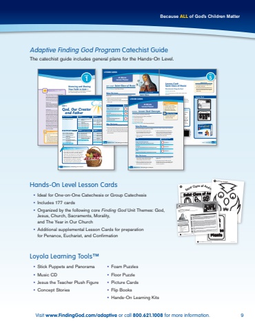 Visit www.FindingGod.com/adaptive or call 800.621.1008 for more information. 9Adaptive Finding God Program Catechist GuideThe catechist guide includes general plans for the Hands-On Level.Hands-On Level Lesson Cards%u2022 Ideal for One-on-One Catechesis or Group Catechesis%u2022 Includes 177 cards%u2022 Organized by the following core Finding God Unit Themes: God, Jesus, Church, Sacraments, Morality,and The Year in Our Church%u2022 Additional supplemental Lesson Cards for preparation for Penance, Eucharist, and Confirmation Loyola Learning Tools%u2122%u2022 Stick Puppets and Panorama%u2022 Music CD%u2022 Jesus the Teacher Plush Figure%u2022 Concept Stories%u2022 Foam Puzzles%u2022 Floor Puzzle%u2022 Picture Cards%u2022 Flip Books%u2022 Hands-On Learning Kits3-Minute RetreatUNIT1Knowing and Sharing Your Faith in Unit 1Consider how Scripture and Tradition can deepen your understanding of the unit content.ScriptureGenesis 1:1%u201331 shows how all creation is good as created by God.Matthew 6:9%u201313 shows how Jesus teaches us to pray to God our Father.TraditionThe whole of the Catholic story is about God%u2019s care and concern for us. We are made in God%u2019s image and likeness. (Genesis 1:27) In the Bible we learn that God is Father, Son, and Holy Spirit. (Matthew 28:19%u201320) All God wants us to know is how much we are loved and to love one another. (1 John 4:11%u201312)Catholic Social TeachingCatholic Social Teaching themes relevant for this unit are Life and Dignity of the Human Person and Care for God%u2019s Creation. See page 452 for an explanation of these themes.Window on the CatechismCreation as the loving work of the Holy Trinity is discussed in CCC 290%u2013302. God%u2019s revelation of his love and goodness is found in CCC 51%u201353. General Directory for CatechesisThe revelation of God%u2019s providential plan for us is found in GDC 36. PrayerPray to God our Creator using these words or your own.God, loving Father and Creator, help me be a person who shares your love with others, especially with the child I%u2019ll accompany this year. Please bless us and help us see your face in each other and in your creation. Amen.Before you prepare to teach this unit, go to a quiet place where you can be still. Take several deep breaths. Let your imagination take you to the place deep inside where God dwells. Be aware of God%u2019s loving presence as you open yourself to God%u2019s Word. Genesis 1:27God created mankind in his image; in the image of God he created them; male and female he created them. ReflectionGod made the earth, sky, sun and moon, plants and animals and saw how good they were%u2014the perfect home for human beings. God loved us all into being, including you and the child you teach. Think about that. You are loved unconditionally, at all times. The first chapter of Genesis tells about the beginning of creation%u2014how God created light from darkness, gave order to the universe, separated land from water, made animals, and finally created the human family before he rested. God loves us as much today as he did on those very first days. So no matter what the beginning of this year brings for you, know that you are loved by God, your Creator and Father.UNIT 1 3i_002-007_4014_CG_T1U01S01_LC.indd ~ pg 3 ~ LoyolaPress. 7/14/14 3:38 PMPDF Signoff: Production _______ Design _______ Editorial _______Unit 1 focuses on God as our Creator and Father. As you plan your lessons, consider exploring God%u2019s creation with the child with parents%u2019 permission. You might go on a God%u2019s creation walk, noting things that God has made; you might go on a picnic and enjoy a snack of fruits and vegetables; you might plan an earlyevening backyard %u201ccampout,%u201d watching stars and listening for creatures. We live in a wonderful world%u2014have fun sharing it!Your Creative SideUNIT 1God, Our Creator and Father UNIT 1 OPENER SAINT SESSION 1: GOD CREATES THE WORLDSESSION 2: GOD IS OUR FATHERSaint Hildegard of Bingen CARD 1A: God Creates the Earth and the SkyCARD 1B: God Creates the Sun, Moon, and StarsCARD 1C: God Creates PlantsCARD 1D: God Creates AnimalsCARD 1E: God Creates PeopleLEARNING TOOL LESSON CARD 2A: God Made Us GoodCARD 2B: God Loves All His Children CARD 2C: God Gives Us What We NeedCARD 2D: God Gives Us the BibleCARD 2E: God Calls Us to Love LEARNING TOOL LESSON SESSION 3: GOD IS THE FATHER, SON, AND HOLY SPIRITSESSION 4: WE TALK TO GOD IN PRAYERSESSION 5: WE PRAY THE LORD%u2019S PRAYERCARD 3A: God Is Our FatherCARD 3B: Jesus Is God the SonCARD 3C: God the Holy Spirit Guides UsCARD 3D: God Is Father, Son, and Holy SpiritCARD 3E: We Use Words, Pictures, and Gestures to Remind Us of the TrinityLEARNING TOOL LESSON CARD 4A: We Tell God We Love HimCARD 4B: We Thank GodCARD 4C: We Praise GodCARD 4D: We Tell God We Are SorryCARD 4E: We Ask God for Help for Ourselves and OthersLEARNING TOOL LESSON CARD 5A: We Honor and Respect God and His NameCARD 5B: We Ask God to Show Us How to Live and ActCARD 5C: We Ask God for What We NeedCARD 5D: We Ask God for ForgivenessCARD 5E: We Ask God to Guide UsLEARNING TOOL LESSON2 Hands-On Level www.findinggod.com/adaptivei_002-007_4014_CG_T1U01S01_LC.indd ~ pg 2 ~ LoyolaPress. 7/14/14 3:38 PMPDF Signoff: Production _______ Design _______ Editorial _______45-Minute Lesson%u00a0PlannerUNIT SAINTPrayer in the Unit 5 OpenerSchedule a time to take the child on a prayer walk. Tell the child that he or she can pray anywhere, anytime. Stop along the walk and say: God is here. Let%u2019s pray a prayer to him right now. Take a moment to pray a short prayer with the child. Stop a few more times to say a short, simple prayer, recognizing God%u2019s presence in all that surrounds us. Encourage the child to see that no matter where he or she is, God is always there. What You Need%u25b6 Materials listed on Side A of the Unit Opener Lesson CardSaint Clare of%u00a0Assisi Saint Clare was a young girl from Assisi, Italy. She admired Saint Francis. When she wa