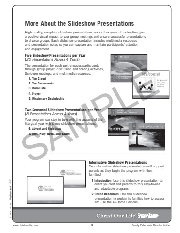 www.christourlife.com 9 Family Catechesis Director Guide5857 %u00a9 All rights reserved.%u00aeMore About the Slideshow PresentationsHigh-quality, complete slideshow presentations across four years of instruction give a positive visual impact to your group meetings and ensure successful presentations to diverse groups. Each slideshow presentation includes multimedia resources and presentation notes so you can capture and maintain participants%u2019 attention and%u00a0engagement.Five Slideshow Presentations per Year (20 Presentations Across 4 Years) The presentation for each part engages participants through group prayer, discussion and sharing activities, Scripture readings, and multimedia resources. 1. The Creed2. The Sacraments3. Moral Life4. Prayer5. Missionary DiscipleshipInformative Slideshow Presentations Two informative slideshow presentations will support parents as they begin the program with their families!1 Introduction Use this slideshow presentation to orient yourself and parents to this easy-to-use and adaptable program.2 Online Resources Use this slideshow presentation to explain to families how to access and use the At-Home Editions.Two Seasonal Slideshow Presentations per Year (8 Presentations Across 4 Years) Your program can stay in tune with the seasons of the liturgical year with these slideshow presentations. 6. Advent and Christmas7. Lent, Holy Week, and EasterSAMPLE