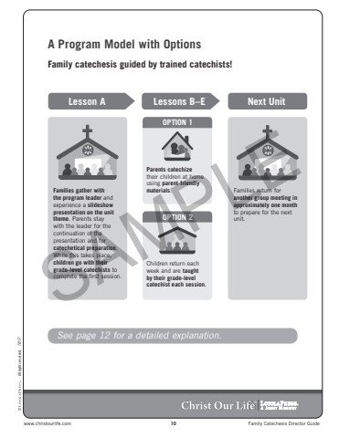 www.christourlife.com 10 Family Catechesis Director Guide5857 %u00a9 All rights reserved.%u00aeA Program Model with OptionsFamily catechesis guided by trained catechists!See page 12 for a detailed explanation.Lesson A Lessons B%u2013E Next UnitOPTION 1OPTION 2Families gather with the program leader and experience a slideshow presentation on the unit theme. Parents stay with the leader for the continuation of the presentation and for catechetical preparation. While this takes place, children go with their grade-level catechists to complete the first session.Parents catechizetheir children at home using parent-friendly materials. Families return for another group meeting in approximately one monthto prepare for the next unit.Children return each week and are taught by their grade-level SAMPLEcatechist each session.