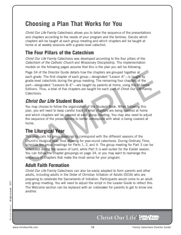 www.christourlife.com 13 Family Catechesis Director Guide5857 %u00a9 All rights reserved.%u00aeChoosing a Plan That Works for You Christ Our Life Family Catechesis allows you to tailor the sequence of the presentations and chapters according to the needs of your program and the families. Decide which chapters will be taught at each group meeting and which chapters will be taught at home or at weekly sessions with a grade-level catechist.The Four Pillars of the Catechism Christ Our Life Family Catechesis was developed according to the four pillars of the Catechism of the Catholic Church and Missionary Discipleship. The implementation models on the following pages assume that this is the plan you will be following. Page 34 of the Director Guide details how the chapters are grouped together at each grade. The first chapter of each group%u2014designated %u201cLesson A%u201d%u2014is taught by grade-level catechists during the group meeting. The remaining four chapters of the part%u2014designated %u201cLessons B%u2013E%u201d%u2014are taught by parents at home, using the At-Home Editions. Thus, a total of five chapters are taught for each part of Christ Our Life Family Catechesis. Christ Our Life Student Book You may choose to follow the organization of the Student Book. When following this plan, you will need to keep careful track of what chapters are being covered at home and which chapters will be covered at each group meeting. You may also need to adjust the sequence of the presentations to better correspond with what is being covered at home. The Liturgical Year This plan calls for group meetings to correspond with the different seasons of the Church%u2019s liturgical year, thus allowing for year-round catechesis. During Ordinary Time, schedule the group meetings for Parts 1, 2, and 4. The group meeting for Part 3 can be scheduled during the season of Lent, while Part 5 is well-suited for the Easter season. You can follow the chapter groupings on page 34, or you may want to rearrange the sequence of chapters that make the most sense for your program. Adult Faith Formation Christ Our Life Family Catechesis can also be easily adapted to form parents and other adults, including adults in the Order of Christian Initiation of Adults (OCIA) who are preparing to celebrate the Sacraments of Initiation. Participants would come to an adultonly group meeting. You will need to adjust the script in the Leader Guide to reflect this. The Welcome section can be replaced with an icebreaker for parents to get to know one another. SAMPLE