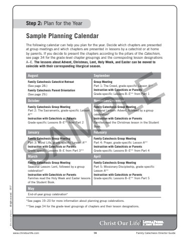 www.christourlife.com 14 Family Catechesis Director Guide5857 %u00a9 All rights reserved.%u00aeStep 2: Plan for the YearSample Planning CalendarThe following calendar can help you plan for the year. Decide which chapters are presented at group meetings and which chapters are presented in lessons by a catechist or at home by parents. If you decide to present the chapters according to the pillars of the Catechism,see page 34 for the grade-level chapter groupings and the correspoding lesson designations A%u2013E. The lessons about Advent, Christmas, Lent, Holy Week, and Easter can be moved to coincide with their corresponding liturgical season.August SeptemberFamily Catechesis Catechist Retreat (See page 28.)Family Catechesis Parent Orientation (See page 29.)Group Meeting Part 1: The Creed, grade-specific Lesson A** Instruction with Catechists or ParentsGrade-specific Lessons B%u2013E** from Part 1October November/DecemberFamily Catechesis Group Meeting Part 2: The Sacraments, grade-specific Lesson A**Instruction with Catechists or ParentsGrade-specific Lessons B%u2013E** from Part 2Family Catechesis Group Meeting Seasonal Lesson: Advent, followed by a group celebration*Instruction with Catechists or ParentsFamilies read the Christmas lesson in the Student Book.January FebruaryFamily Catechesis Group Meeting Part 3: Moral Life, grade-specific Lesson A** Instruction with Catechists or Parents Grade-specific Lessons B%u2013E from Part 3**Family Catechesis Group Meeting Part 4: Prayer, grade-specific Lesson A** Instruction with Catechists or ParentsGrade-specific Lessons B%u2013E** from Part 4March AprilFamily Catechesis Group Meeting Seasonal Lesson: Lent, followed by a group celebration*Instruction with Catechists or ParentsFamilies read the Holy Week and Easter lessons of the Student Book.Family Catechesis Group Meeting Part 5: Missionary Discipleship, grade-specific Lesson A**Instruction with Catechists or ParentsGrade-specific Lessons B%u2013E** from Part 5MayEnd-of-year group celebration**See pages 19%u201320 for more information about planning group celebrations.**See page 34 for the grade-level groupings of chapters and their lesson designations.SAMPLE