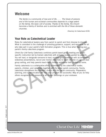 www.christourlife.com 4 Family Catechesis Director Guide5857 %u00a9 All rights reserved.%u00aeWelcomeThe family is a community of love and of life. . . . The future of persons and of the human and ecclesial communities depends to a large extent on the family, the basic cell of society. Thanks to the family, the Church becomes a family of families and is enriched with the life of these domestic churches.Directory for Catechesis #226Your Role as Catechetical LeaderRoles for catechetical leaders vary from parish to parish and from diocese to diocese. What is consistent is the challenge of providing guidance, support, and resources for all who take part in your parish%u2019s faith formation program. This is true when leading your parish%u2019s family catechesis program. Christ Our Life Family Catechesis combines parish-based group meeting and gradespecific instruction led by trained catechists with at-home lessons guided by parents. You will lead, or designate someone to lead, monthly group meetings with accompanying slideshow presentations, recruit and mentor catechists to teach children in a grade-level group setting, and help parents teach their children additional faith content at home. Family catechesis is a collaborative effort undertaken by the catechetical leader, parents, children, and catechists together with the wider parish community. Family catechesis strengthens the domestic church and the parish community. Preparation, planning, and communication will help your program be successful. May all you do help others recognize God%u2019s presence in all things! Blessings on your endeavor.SAMPLE