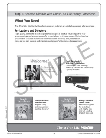 www.christourlife.com 6 Family Catechesis Director Guide5857 %u00a9 All rights reserved.%u00aeFamily Catechesis Director Guide: Program setup and management Digitally deliveredFamily Catechesis Leader Guide:Presentation guide for slideshows with helpful tips and full scripting Digitally%u00a0deliveredFamily Catechesis Slideshow Presentations:Used to open each meeting; viewed by families and parents only Digitally deliveredStep 1: Become Familiar with Christ Our Life Family CatechesisWhat You NeedThe Christ Our Life Family Catechesis program materials are digitally accessed after%u00a0purchase.For Leaders and DirectorsHigh-quality, complete slideshow presentations give a positive visual impact to your group meetings and ensure successful presentations to diverse groups. Each slideshow presentation includes multimedia (internet access required) and presentation notes so you can capture and maintain participants%u2019 attention and%u00a0engagement.SAMPLE