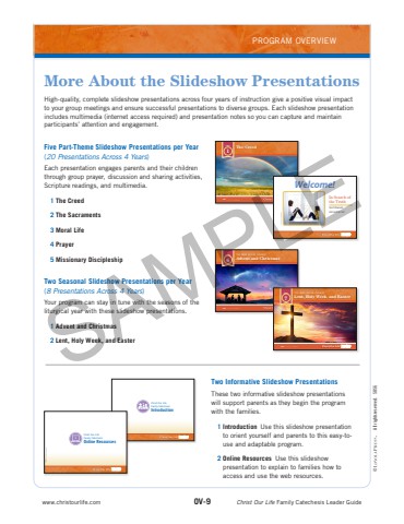 Christ Our Life Family CatechesisIntroduction%u00aeYEAR 1Christ Our Life Family CatechesisOnline Resources%u00aeYEAR 1YEAR 1 %u00aeThe Creed PART1In Search ofthe TruthGod Reveals Himself to UsWelcome!%u00aeYEAR 1 %u00aePART6THE YEAR IN OUR CHURCHAdvent and ChristmasYEAR 1 %u00aeTHE YEAR IN OUR CHURCHLent, Holy Week, and EasterPART7More About the Slideshow PresentationsHigh-quality, complete slideshow presentations across four years of instruction give a positive visual impact to your group meetings and ensure successful presentations to diverse groups. Each slideshow presentation includes multimedia (internet access required) and presentation notes so you can capture and maintain participants%u2019 attention and engagement.Five Part-Theme Slideshow Presentations per Year(20 Presentations Across 4 Years)Each presentation engages parents and their children through group prayer, discussion and sharing activities, Scripture readings, and multimedia. 1 The Creed2 The Sacraments3 Moral Life4 Prayer5 Missionary DiscipleshipTwo Seasonal Slideshow Presentations per Year (8 Presentations Across 4 Years)Your program can stay in tune with the seasons of the liturgical year with these slideshow presentations. 1 Advent and Christmas2 Lent, Holy Week, and EasterTwo Informative Slideshow Presentations These two informative slideshow presentations will support parents as they begin the program with the families.1 Introduction Use this slideshow presentation to orient yourself and parents to%u00a0this easy-touse and adaptable program.2 Online Resources Use this slideshow presentation to explain to families how to access and use the web resources. PROGRAM OVERVIEWwww.christourlife.com OV-9 Christ Our Life Family Catechesis Leader Guide%u00a9 All rights reserved.SAMPLE5856