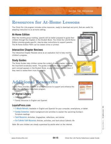 Resources for At-Home LessonsThe Christ Our Life program includes online resources, ready to download and print, that are useful for adapting instruction to an at-home setting.At-Home EditionAfter the monthly group meeting, parents will be better prepared to guide their children through the chapters in the Student Book. The Christ Our Life At-Home Edition provides grade-specific, step-by-step instructions to support parents. The At-Home Edition PDFs can be viewed online or printed.Interactive Chapter ReviewsThe Interactive Chapter Reviews serve as an evaluation tool to help monitor children%u2019s progress.Study GuidesThe Study Guides help children review the content of each chapter, including the important vocabulary words. The guides include the page number where each concept appears in the Student Book, so your children can find them if they need to review them more thoroughly.Additional ResourcesLoyola Press provides a wealth of online resources to support and enhance theChrist Our Life Family%u00a0Catechesis program. LP Digital Library%u2022 Seasonal resources%u2022 Family resources in English and SpanishLoyolaPress.com%u2022 3-Minute Retreats: Available in English and Spanish for your computer, smartphone, or tablet%u2022 Sunday Connection: Useful background and activities to explain the upcoming Sunday%u2019s Scripture%u00a0readings%u2022 Saint Resources: Activities, biographies, reflections, and%u00a0stories%u2022 Our Catholic Faith Resources: Articles, activities, and facts about Catholic lifeNote: Be sure children are closely supervised by adults when on the internet. All Rights Reserved w3550 www.christourlife.comwww.christourlife.com Grade 1 %u2022 Unit 1 %u2022 Chapter 1GRADE1 ChAptER 1 Study GuideJesus Is Our Friend Keep these ideas in mind as you study Chapter 1. We pray the Sign of the Cross. We show we are Jesus%u2019 friends.Page 7We end the Sign of the Cross by praying, %u201cAmen.%u201dPage 7Jesus Christ is our friend. Jesus loves everyone. We want to be like Jesus. We want to love%u00a0others. Pages 4 and 5Jesus likes to be with us. Jesus said, %u201cLet the children come to me.%u201d Page 4Jesus died on the Cross for us. The Cross reminds us how much Jesus loves us. Page 6 All Rights Reserved w3542 www.christourlife.comGrade 1 %u2022 Unit 1 %u2022 Chapter 1Christ Our Life%u00ae AT-HOME EDITION Grade 1 UNIT 1Chapter 1Jesus%u2019 LoveTell your child that Jesus loves everyone. Say: Because we are Jesus%u2019 friends, we want to be like him and love others. Discuss ways we bring his love to others. (by being loving, helping others, caring about our friends, being respectful)Invite your child to name some people who love him or her. Ask: How do you know that these people love you? (They are kind and show that they want the best for me; they take care of me; they make me feel safe.)Have your child complete the Someone I Love activity. Ask your child to describe how he or she can be loving to the person in the drawing.Jesus Shows His LoveDisplay a crucifix or show a picture of one. Say: This is a crucifix. It is a cross with the image of Jesus on it. Jesus died on the Cross for us because he loves us so much. [Pause.] Whenever we look at a cross or a crucifix, we can remember that Jesus died for us, rose from the dead, and is with us now. Read aloud the text on page 6. Call your child%u2019s attention to the Word to Know feature. Read aloud the definition for Sign of the Cross. Make the Sign of the Cross on your child%u2019s forehead, and say a short blessing, %u201cYou are a child of God. God loves you, and so do I.%u201dLead your child in prayer using the A Moment with Jesus feature. Pray the Sign of the Cross to conclude the prayer.The Sign of the CrossRead aloud the sentences at the top of the page. Say: When we pray the Sign of the Cross, we trace a cross on ourselves. Have your child raise his or her right hand and refer to the pictures to make the five gestures without the words. Then repeat the gestures, adding the words. Say: When we pray the Sign of the Cross, we bless ourselves by asking God to bless us. Discuss times you can pray the Sign of the Cross. (first thing in the morning and last thing at night; at mealtime; when we enter a church; anytime) If you choose, scan the QR code on page 7 and watch the video together.Chapter Review Help your child complete the Chapter 1 Review. Start with We Remember. Ask each question and invite your child to respond. Say: Look at the We Respond section. Let%u2019s pray this together: %u201cI love you, Jesus.%u201d Have your child repeat the prayer. Review the Word to Know in this chapter by locating the word and its definition in the Glossary. Consider bookmarking the first page of the Glossary so it will be easy to access the next time. Page 5Page 6Page 7Page 8 All Rights Reserved w3542 www.christourlife.comChrist Our Life%u00ae AT-HOME EDITION Grade 1 UNIT 1Chapter 1Grade 1 %u2022 Unit 1 %u2022 Chapter 1Then look through the book together. Say: In Unit 1, we will learn what God is like and how we can talk and listen to God. Invite your child to turn to page 1. Read aloud the unit title, God Is Our Good Father.Discuss the pictures on the page. Point out the picture at top left and ask your child to describe what he or she sees (children praying before a meal). Then talk about the top right illustration (the outside of a church) and the bottom illustration (people worshiping God inside a church). Explain to your child that he or she will learn about God and about some holy things we see in church. Spend some time on the bottom image, asking your child to point to different people and objects (crucifix, altar, priest, deacon, cantor singing, church members going to Holy Communion).Have your child identify the Scripture passage (at the bottom of page 1). Then explain that the words are from our holy book, the Bible. Show the Bible. Next, read aloud the Scripture passage.If you choose, scan the QR code on the page and watch th