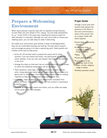 Prayer CenterArrange a focal point with symbols that express the presence of the Word of God and communicate a sense of the sacred. Set up a prayer center with these%u00a0supplies:%u2022small table, prominently placed%u2022cloth table cover, changed to reflect each liturgical%u00a0season%u2022Bible%u2022small plant or flowers%u2022one or more of the following: bowl of holy water, crucifix, religious image or statue%u2022battery-operated candlePrepare a Welcoming EnvironmentWhen Jesus planned a special meal with his Apostles during Passover, he sent Peter and John ahead of him, saying, %u201cGo and make preparations for us.%u201d (Luke 22:8) In the same way, preparing the physical space for faith formation is important. Although you may not be able to choose your meeting space, you can take steps to make it welcoming.No matter your environment, give families a sense of belonging where they can be comfortable learning and sharing. The best way to support and encourage any group is to have a welcoming spirit. Greet parents and children at the door as they arrive. %u2022 Arrive 20%u201330 minutes early to prepare the space and to center yourself. If you are rushed and frantic, the participants will feel the same; likewise, if you are calm and relaxed, that tone will be reflected in the room.%u2022 Arrange the chairs so that each has an unobstructed view of the screen on which the slideshow presentation will be projected.%u2022 Place handouts, name tags, or other materials on a table near the entry. Using preprinted name tags will make it easy for you to see at a glance who is not present. Consider affixing the name tags to meeting materials so they can be retrieved by the participants later.%u2022 If possible, make all aspects of your environment consistent from month to month. Parents and children will find comfort in returning to a familiar space.%u2022 Consider providing light snacks and drinks, such as coffee and water, but be aware of any food allergies.www.christourlife.com OV-17 Christ Our Life Family Catechesis Leader GuideTHE EFFECTIVE LEADER%u00a9 All rights reserved.SAMPLE5856
