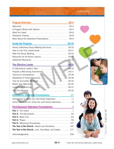 Program Overview OV-4Welcome!................................................ OV-4A Program Model with Options ............................. OV-5What You Need........................................... OV-6Slideshow Themes ........................................ OV-8More About the Slideshow Presentations .................... OV-9Inside the Program OV-10Family Catechesis Group-Meeting Structure ................. OV-10How to Use This Leader Guide ............................ OV-11After the Group Meeting .................................. OV-14Resources for At-Home Lessons ........................... OV-15Additional Resources ..................................... OV-15The Effective Leader OV-16A Catechetical Leader%u2019s Role .............................. OV-16Prepare a Welcoming Environment ......................... OV-17Technical Considerations ................................. OV-18Availability of Online Resources............................ OV-18Tips for Successful Meetings.............................. OV-19Widen Your Welcome..................................... OV-20Long-Range Planning..................................... OV-21The First Meeting ........................................ OV-24Informative Slideshow Presentations i-1Introduction to Christ Our Life Family Catechesis ............... i-1Online Resources for Christ Our Life Family Catechesis .......... i-9Part/Seasonal Slideshow Presentations 1Part 1: The Creed. .......................................... 1Part 2: The Sacraments ..................................... 35Part 3: Moral Life .......................................... 63Part 4: Prayer.............................................. 93Part 5: Missionary Discipleship ............................. 117The Year in Our Church: Advent and Christmas ............... 147The Year in Our Church: Lent, Holy Week, and Easter.......... 177Acknowledgments......................................... 209www.christourlife.com OV-3 Christ Our Life Family Catechesis Leader GuideCONTENTS%u00a9 All rights reserved.SAMPLE5856