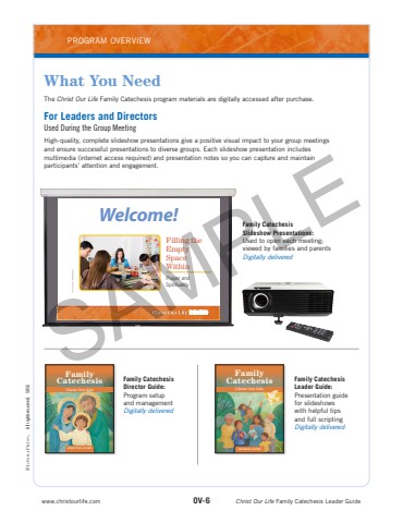DIRECTOR GUIDEChrist Our LifeFamilyCatechesis %u00ae Christ Our Life%u00aeFamilyCatechesisLEADER GUIDEFilling the Empty Space WithinPrayer and Spirituality Welcome!%u00aeWhat You NeedThe Christ Our Life Family Catechesis program materials are digitally accessed after purchase.For Leaders and DirectorsUsed During the Group MeetingHigh-quality, complete slideshow presentations give a positive visual impact to your group meetings and ensure successful presentations to diverse groups. Each slideshow presentation includes multimedia (internet access required) and presentation notes so you can capture and maintain participants%u2019 attention and engagement.Family Catechesis Director Guide: Program setup and management Digitally deliveredFamily Catechesis Leader Guide:Presentation guide for slideshows with%u00a0helpful tips and%u00a0full scripting Digitally deliveredFamily Catechesis Slideshow Presentations:Used to open each meeting; viewed by families and parents Digitally deliveredPROGRAM OVERVIEWwww.christourlife.com OV-6 Christ Our Life Family Catechesis Leader Guide%u00a9 All rights reserved. 5856SAMPLE