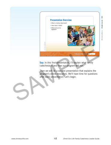 %u00aePresentation Overview%u2022 What is family catechesis?%u2022 How does it work?%u2022 What will we do together?Say: In this first presentation, I%u2019ll explain what family catechesis is and how our program will run.Then we will do a second presentation that explains the program%u2019s online resources. We%u2019ll have time for questions after each presentation. Let%u2019s begin.www.christourlife.com i-2 Christ Our Life Family Catechesis Leader Guide%u00a9 All rights reserved. 5856SAMPLE