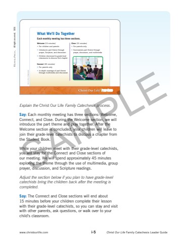 %u00aeWhat We%u2019ll Do TogetherEach monthly meeting has three sections.Welcome (15 minutes)%u2022 For children and parents%u2022 Introduces part theme through prayer, Scripture, and discussion%u2022 Children dismissed to grade-level classrooms to discuss first chapterConnect (30 minutes)%u2022 For parents only%u2022 In-depth coverage of part theme through%u00a0multimedia and discussionClose (15 minutes)%u2022 For parents only%u2022 Summarizes part theme through prayer, discussion, and multimediaExplain the Christ Our Life Family Catechesis process.Say: Each monthly meeting has three sections: Welcome, Connect, and Close. During the Welcome section, we will introduce the part theme and pray together. After the Welcome section is concluded, your children will leave to join their grade-level catechists to discuss a chapter from the Student Book. While your children meet with their grade-level catechists, you will stay for the Connect and Close sections of our meeting. We will spend approximately 45 minutes exploring the theme through the use of multimedia, group prayer, discussion, and Scripture readings.Adjust the section below if you plan to have grade-level catechists bring the children back after the meeting is completed. Say: The Connect and Close sections will end about 15%u00a0minutes before your children complete their lesson with their grade-level catechists, so you can stay and visit with other parents, ask questions, or walk over to your child%u2019s classroom.www.christourlife.com i-5 Christ Our Life Family Catechesis Leader Guide%u00a9 All rights reserved. 5856SAMPLE