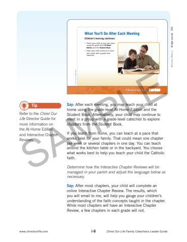 %u00aeWhat You%u2019ll Do After Each MeetingChildren%u2019s learning continues.%u2022 Teach your child at your own pace, using the grade-level At-Home Edition and the Student Book.%u2022 Have your child continue to meet each week with a grade-level catechist.Say: After each meeting, you may teach your child at home using the grade-level At-Home Edition and the Student Book. Alternatively, your child may continue to meet in a group with a grade-level catechist to explore chapters from the Student Book.If you teach from home, you can teach at a pace that works best for your family. That could mean one chapter per week or several chapters in one day. You can teach around the kitchen table or in the backyard. You choose what works best to help you teach your child the Catholic faith.Determine how the Interactive Chapter Reviews will be managed in your parish and adjust the language below as necessary. Say: After most chapters, your child will complete an online Interactive Chapter Review. The results, which you will email to me, will help you gauge your children%u2019s understanding of the faith concepts taught in the chapter. While most chapters will have an Interactive Chapter Review, a few chapters in each grade will not.Refer to the Christ Our Life Director Guide for more information on the At-Home Edition and Interactive Chapter Reviews.Tipwww.christourlife.com i-6 Christ Our Life Family Catechesis Leader Guide%u00a9 All rights reserved. 5856SAMPLE