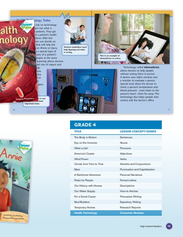 13GRADE 4TITLE LESSON CONCEPT/GENREThe Body in Motion SentencesEye on the Universe NounsWhat a Job! PronounsAmerica's Coasts AdjectivesWind Power VerbsClocks from Time to Time Adverbs and ConjunctionsMars Punctuation and CapitalizationA Rainforest Adventure Personal NarrativesParks for People Formal LettersOur History with Horses DescriptionsOur Water Supply How-to ArticlesFor a Good Cause Persuasive WritingMud Builders Expository WritingTemporary Homes Research ReportsHealth Technology Consumer ReviewsWritten by Lisa ShulmanIllustrated by Jos%u00e9e MasseAe nni NonfictionFictionWritten by Barbara Davisealth nologyNonfictionFictionHigh-Interest Readers