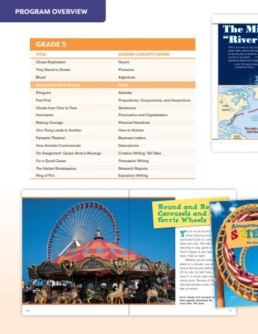 AmusemeSCIEDan GrePROGRAM OVERVIEWGRADE 5TITLE LESSON CONCEPT/GENREOcean Exploration NounsThey Dared to Dream PronounsBlood AdjectivesAmusement Park Science VerbsPenguins AdverbsFeet First Prepositions, Conjunctions, and InterjectionsClocks from Time to Time SentencesHurricanes Punctuation and CapitalizationRaising Courage Personal NarrativesOne Thing Leads to Another How-to ArticlesFantastic Plastics! Business LettersHow Animals Communicate DescriptionsOn Assignment: Queen Anne's Revenge Creative Writing: Tall TalesFor a Good Cause Persuasive WritingThe Harlem Renaissance Research ReportsRing of Fire Expository Writing
