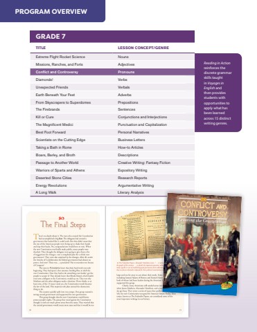 Reading in Action reinforces the discrete grammar skills taught in Voyages in English and then provides students with opportunities to apply what has been learned across 15 distinct writing genres.PROGRAM OVERVIEWGRADE 7TITLE LESSON CONCEPT/GENREExtreme Flight Rocket Science NounsMissions, Ranches, and Forts AdjectivesConflict and Controversy PronounsDiamonds! VerbsUnexpected Friends VerbalsEarth Beneath Your Feet AdverbsFrom Skyscrapers to Superdomes PrepositionsThe Firebrands SentencesKill or Cure Conjunctions and InterjectionsThe Magnificent Medici Punctuation and CapitalizationBest Foot Forward Personal NarrativesScientists on the Cutting Edge Business LettersTaking a Bath in Rome How-to ArticlesBoars, Barley, and Broth DescriptionsPassage to Another World Creative Writing: Fantasy FictionWarriors of Sparta and Athens Expository WritingDeserted Stone Cities Research ReportsEnergy Revolutions Argumentative WritingA Long Walk Literary AnalysisConfliCt and ControversyCreating the ConstitutionDaniel Benjamincontroversy \\k%u00e4n%u00b4 tr%u0259 v%u0259r s%u0113\\ n. 1. a discussion in which people express opposing views; 2. a disagreement over ideas; 3. a quarrelReading and Writing Informational TextMain Text Structures%u2022Problem/Solution%u2022Compare/ContrastText Features%u2022Primary Sources%u2022Map%u2022Sidebar%u2022Fact BoxesComprehension Focus%u2022QuestioningWriting Focus%u2022Compare/Contrast Paragraph822334GenreSubject/StrandKey Words VocabularyNarrative, NonfictionSoc. Studies/US Hist. & CivicsConstitutional Convention, delegatesdebt, talent, deserve, threaten, depressedLevelGRL TLexile 850L822334_C_Conflict.indd 1 2/22/12 12:29 PM