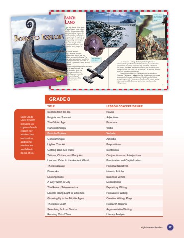 Each Grade Level System includes six copies of each reader. For whole-class instruction, additional readers are available in packs of six.17GRADE 8TITLE LESSON CONCEPT/GENRESecrets from the Ice NounsKnights and Samurai AdjectivesThe Gilded Age PronounsNanotechnology VerbsBorn to Explore VerbalsConstantinople AdverbsLighter Than Air PrepositionsGetting Back On Track SentencesTattoos, Clothes, and Body Art Conjunctions and InterjectionsLaw and Order in the Ancient World Punctuation and CapitalizationThe Breakaway Personal NarrativesFireworks How-to ArticlesLooking Inside Business Letters A City Within A City DescriptionsThe Ruins of Mesoamerica Expository WritingLasers: Taking Light to Extremes Persuasive WritingGrowing Up in the Middle Ages Creative Writing: PlaysThe Black Death Research ReportsSearching for Lost Tombs Argumentative WritingRunning Out of Time Literary Analysisnew BORN TO EXPLORE Sandra Widener822304High-Interest Readers