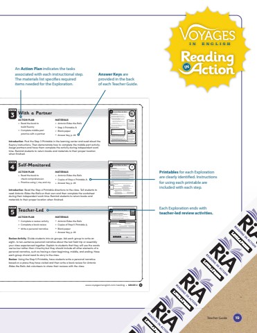 With a Partner STEP3Self-MonitoredTeacher-LedIntroduction Read the Step 4 Printable directions to the class. Tell students to read Antonio Rides the Rails on their own and then complete the worksheet during their independent work time. Remind students to return books and materials to their proper location when finished.Review Activity Divide students into six groups. Ask each group to write an eight- to ten-sentence personal narrative about the last field trip or assembly your class experienced together. Explain to students that they will use the words we/us/our rather than I/me/my but they should include all other elements of a personal narrative, such as having a clear beginning, middle, and ending. Have each group choral read its story to the class.Review Using the Step 5 Printable, have students write a personal narrative based on a place they have visited and then write a book review for Antonio Rides the Rails. Ask volunteers to share their reviews with the class. STEP4STEP5Introduction Post the Step 3 Printable in the learning center and read aloud the fluency instructions. Then demonstrate how to complete the middle part activity. Assign partners and have them complete the activity during independent work time. Remind students to return books and materials to their proper location when finished.ACTION PLANRead the book to build fluencyComplete middle part practice with a partnerMATERIALSAntonio Rides the RailsStep 3 Printable Blank paperAnswer Key, p. 29ACTION PLANRead the book to check comprehensionPractice using I, me, and myMATERIALSAntonio Rides the RailsCopies of Step 4 Printable Answer Key, p. 29ACTION PLANComplete a review activityComplete a book reviewWrite a personal narrativeMATERIALSAntonio Rides the RailsCopies of Step 5 Printable Blank paperAnswer Key, p. 293STEPPrint and display this poster in your Reading in Action learning center for partner work.PERSONAL NARRATIVE WRITING TIP A personal narrative always has a middle part. The middle of the story should tell main events in time order. Include more than one middle sentence to make your personal narrative interesting.FLUENCY TIPAs you read aloud, notice when you stumble at a sentence. When you get to the end of a paragraph or page, go back to the sentence and read it again. Practice as many times as you need to get it right! FLUENCY PRACTICE 1 First reading: Read Antonio Rides the Rails with your partner. Take turns reading every other page. 2 Second and third readings: Now take turns reading the whole story. You read first, then your partner. Answer these questions together:Where did we stumble at first that became easier to read the second time? Where do we need to practice reading more smoothly next time? 3 When you finish, turn to pages 8 and 9. Look at the picture. Describe what is happening. Ask your partner how the picture makes him or her feel.MIDDLE PART PRACTICE1 Read the beginning and ending sentences below. Beginning: My family packed the car for vacation.Middle:Ending: We left the house late, but we still had a great time on our trip.2 On a separate sheet of paper, copy the beginning and ending sentences with several lines of space between them. Then write at least four middle sentences with your partner. You can use the word bank for help or choose your own words.dog bird ran jumped knocked overAntonio Rides the Rails PA RTN ER WO R Kwww.voyagesinenglish.com/reading %u00a9 Loyola Press. All rights reserved. W4300Reading in Action %u2022 Grade 24STEPCOMPREHENSION Read Antonio Rides the Rails. Then answer the questions. 1 Who tells the story? (page 2)2 Why is Antonio nervous about going to Peru? (page 2)3 How does the snowstorm affect the trip to Machu Picchu? (page 9)4 How does Antonio feel about the trip on his way home? (page 12)I, ME, MYWrite the words from the box that best complete each sentence. Some words will be used more than once.Antonio Rides the Rails Imemy1 Mama and Papa waited with at the gate.2 They can read all about adventures.3 felt face grow hot.4 can%u2019t believe that have to go home tomorrow.www.voyagesinenglish.com/readingName %u00a9 Loyola Press. All rights reserved. W4301Reading in Action %u2022 Grade 2Booffl Review 5STEPAntonio Rides the Rails PERSONAL NARRATIVES WORKSHOPThink about a special place you have visited. Then imagine you are telling a friend about it. On a separate sheet of paper, write a personal narrative about this special place. Tell a true story that has a beginning, middle, and ending. Use more than one sentence in the middle. Use the words I, me, and my to show that the story is about you.This story is about a boy named who The part of the story I liked the best was If I went on a trip to Peru, I would Rating: I gave this book stars because What did you think about Antonio Rides the Rails?Write a review. Then share your review!Title: Antonio Rides the RailsAuthor: Katacha D%u00edazFiction or Nonfi ction (circle one) www.voyagesinenglish.com/readingName %u00a9 Loyola Press. All rights reserved. W4302Reading in Action %u2022 Grade 2www.voyagesinenglish.com/reading %u2022 GRADE 2 15An Action Plan indicates the tasks associated with each instructional step. The materials list specifies required items needed for the Exploration. Printables for each Exploration are clearly identified. Instructions for using each printable are included with each step. Answer Keys are provided in the back of each Teacher Guide. Each Exploration ends with teacher-led review activities.IN ENGLISHTeacher Guide 19