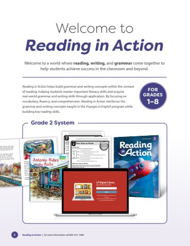 Welcome to Reading in ActionWelcome to a world where reading, writing, and grammar come together to help students achieve success in the classroom and beyond.Reading in Action helps build grammar and writing concepts within the context of reading, helping students master important literacy skills and acquire real-world grammar and writing skills through application. By focusing on vocabulary, fluency, and comprehension, Reading in Action reinforces the grammar and writing concepts taught in the Voyages in English program while building key reading skills. 2STEPTHE BEGINNING AND THE ENDINGRead this story. It is missing the beginning and ending sentences.Owls were hooting all night. Chirping birds woke me up in the morning.Circle the best beginning sentence for the story.a I went fishing with my family this morning.b I learned a lot on my first camping trip. Circle the best ending sentence for the story.c Now I know the forest is a noisy place to sleep!d I think I will bring an umbrella next time!1 Today Grandma Rosa and Grandpa Pepe took us to , the Lost City.2 We zigzagged up the road to the entrance of the crumbled .3 The lived in Peru a long time ago.4 I had fun on my in Peru!IncasMachu PicchuadventureruinsVOCABULARY Read Antonio Rides the Rails. Choose the word that best completes each sentence. Antonio Rides the Rails www.voyagesinenglish.com/readingName %u00a9 Loyola Press. All rights reserved. W4299Reading in Action %u2022 Grade 22STEPPARTS OF A HOW-TO ARTICLESomeone forgot to label the parts of this how-to article. Help identify the parts. Circle the topic. Underline the list of what you need. Write a check mark next to each step.1 The were easy to follow.2 It helps to something before you build it.3 A of the car was made out of clay. 4 An makes a car run. engineplansmodeldesignVOCABULARY Choose the word that best completes the sentence. Cars: Start to Finish HOW TO MAKE A PEANUT BUTTER AND JELLY SANDWICHIt%u2019s easy to make a peanut butter and jelly sandwich!bread peanut butter jelly knife1 Spread peanut butter on one slice of bread with the knife.2 Spread jelly on the other slice of bread with the knife.3 Put the slices together with the peanut butter and jelly facing.4 Cut your sandwich in half and enjoy it!www.voyagesinenglish.com/readingName %u00a9 Loyola Press. All rights reserved. W4307Reading in Action %u2022 Grade 2Written by Katacha D%u00edazIllustrated by Arvis StewartNonfictionFictionGrade 2 System2 Reading in Action | For more information call 800 - 621-1008FOR GRADES1%u20138