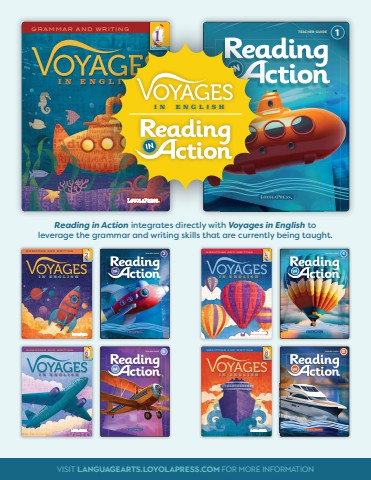 Reading in Action integrates directly with Voyages in English to leverage the grammar and writing skills that are currently being taught. IN ENGLISHGRAMMAR AND WRITINGIN ENGLISH GRAMMAR AND WRITINGIN ENGLISHGRAMMAR AND WRITINGIN ENGLISH GRAMMAR AND WRITINGinto ords day!evel 2: 978-0-8294-4288-5 : 0-8294-4288-XGrade Level 4ISBN-13: 978-0-8294-4294-6 ISBN-10: 0-8294-4294-4What makes a story stir your soul or warm your heart? How does it keep you reading, listening, wanting more? What moves a poem forward or propels a speech into history? Open Voyages in English to find out. Discover how mastering grammar and writing can make your words sing and your sentences soar. Writing is a mighty and powerful form of communication, and it can make you more powerful, too. Where can words take you? Everywhere. What can words do? Everything!Visit www.voyagesinenglish.com to begin your journey today!Where can words take you? What can words do?GRAMMAR AND WRITINGIN ENGLISHGRAMMAR AND WRITING IN ENGLISHIN ENGLISHGRAMMAR AND WRITING296-0 0IN ENGLISHGRAMMAR AND WRITINGGRAMMAR AND WRITING IN ENGLISHGrade Level 8ISBN-13: 978-0-8294-4298-4 ISBN-10: 0-8294-4298-7What makes a story stir your soul or warm your heart? How does it keep you reading, listening, wanting more? What moves a poem forward or propels a speech into history? Open Voyages in English to find out. Discover how mastering grammar and writing can make your words sing and your sentences soar. Writing is a mighty and powerful form of communication, and it can make you more powerful, too. Where can words take you? Everywhere. What can words do? Everything!Visit www.voyagesinenglish.com to begin your journey today!Where can words take you? What can words do?GRAMMAR AND WRITING IN ENGLISHIN ENGLISHGRAMMAR AND WRITINGGRAMMAR AND WRITINGIN ENGLISHTEACHER GUIDE 6INTEACHER GUIDEIN2TEACHER GUIDE 1INTEACHER GUIDEIN8TEACHER GUIDE 4ININ ENGLISHVisit LanguageArts.LoyolaPress.com for more information