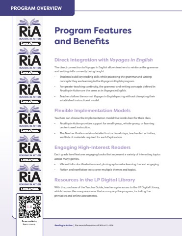 PROGRAM OVERVIEWProgram Features and BenefitsDirect Integration with Voyages in EnglishThe direct connection to Voyages in English allows teachers to reinforce the grammar and writing skills currently being taught.%u2022 Students build key reading skills while practicing the grammar and writing concepts they are learning in the Voyages in English program.%u2022 For greater teaching continuity, the grammar and writing concepts defined in Reading in Action are the same as in Voyages in English.%u2022 Teachers follow the normal Voyages in English pacing without disrupting their established instructional model.Flexible Implementation ModelsTeachers can choose the implementation model that works best for their class. %u2022 Reading in Action provides support for small-group, whole-group, or learning center-based instruction. %u2022 The Teacher Guide contains detailed instructional steps, teacher-led activities, and lists of materials required for each Exploration. Engaging High-Interest ReadersEach grade level features engaging books that represent a variety of interesting topics across many genres. %u2022 Vibrant full-color illustrations and photographs make learning fun and engaging.%u2022 Fiction and nonfiction texts cover multiple themes and topics.Resources in the LP Digital LibraryWith the purchase of the Teacher Guide, teachers gain access to the LP Digital Library, which houses the many resources that accompany the program, including the printables and online assessments.Scan code to learn more. Reading in Action | For more information call 800 - 621-1008