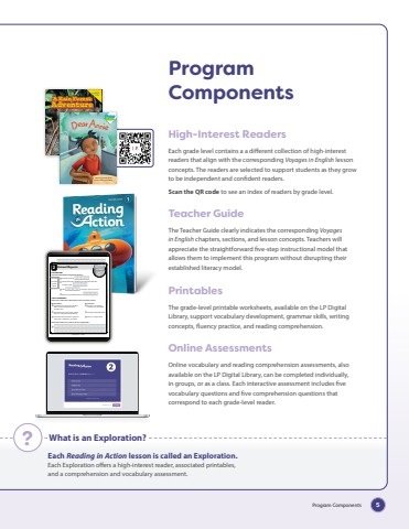 Christine and Anton EconomosA Rain Forest AdventureWritten by Lisa ShulmanIllustrated by Jos%u00e9e MasseDe Annie ar NonfictionFiction2STEPTOPIC SENTENCESDraw a line to match each research report to the correct topic sentence.Write a topic sentence for a research report on giant pandas.4 1 Most bats eat large .2 Animals that have a backbone, hair, and milk to feed their young are called .3 That is carrying a baby in its pouch!4 Bison live on grasslands known as .Research Report1 This animal has a strong jaw and sharp teeth. Its paws are large with long, powerful claws.2 This animal lives on the prairies of North America. It eats grass and small plants.3 This animal eats gum leaves. It gets most of the water it needs from gum leaves.Topic Sentencea The bison is an herbivore, meaning it only eats plants.b The koala rarely drinks water.c The lion is a large animal.mammalsmarsupialprairiesinsectsVOCABULARY Choose the word that best completes the sentence.Animal Reports www.voyagesinenglish.com/readingName %u00a9 Loyola Press. All rights reserved. W4271Reading in Action %u2022 Grade 1Program Components 5Program ComponentsHigh-Interest ReadersEach grade level contains a a different collection of high-interest readers that align with the corresponding Voyages in English lesson concepts. The readers are selected to support students as they grow to be independent and confident readers.Scan the QR code to see an index of readers by grade level.Teacher GuideThe Teacher Guide clearly indicates the corresponding Voyages in English chapters, sections, and lesson concepts. Teachers will appreciate the straightforward five-step instructional model that allows them to implement this program without disrupting their established literacy model.PrintablesThe grade-level printable worksheets, available on the LP Digital Library, support vocabulary development, grammar skills, writing concepts, fluency practice, and reading comprehension. Online AssessmentsOnline vocabulary and reading comprehension assessments, also available on the LP Digital Library, can be completed individually, in groups, or as a class. Each interactive assessment includes five vocabulary questions and five comprehension questions that correspond to each grade-level reader.Each Reading in Action lesson is called an Exploration. Each Exploration offers a high-interest reader, associated printables, and a comprehension and vocabulary assessment.? What is an Exploration?