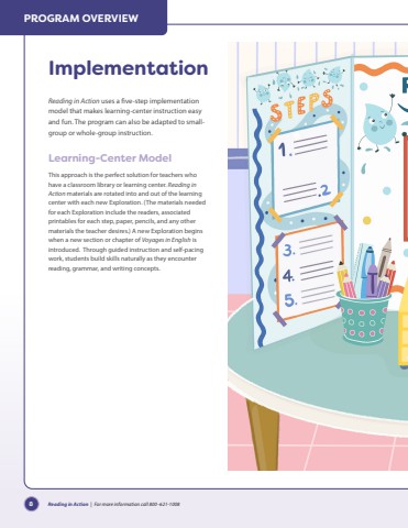 PROGRAM OVERVIEW8ImplementationReading in Action uses a five-step implementation model that makes learning-center instruction easy and fun. The program can also be adapted to smallgroup or whole-group instruction. Learning-Center ModelThis approach is the perfect solution for teachers who have a classroom library or learning center. Reading in Action materials are rotated into and out of the learning center with each new Exploration. (The materials needed for each Exploration include the readers, associated printables for each step, paper, pencils, and any other materials the teacher desires.) A new Exploration begins when a new section or chapter of Voyages in English is introduced. Through guided instruction and self-pacing work, students build skills naturally as they encounter reading, grammar, and writing concepts. Reading in Action | For more information call 800 - 621-1008