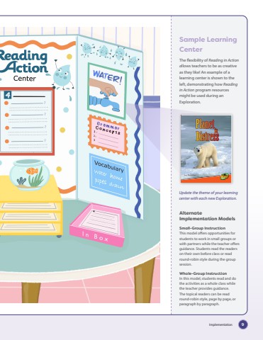 Implementation 9Sample Learning CenterThe flexibility of Reading in Action allows teachers to be as creative as they like! An example of a learning center is shown to the left, demonstrating how Reading in Action program resources might be used during an Exploration. Alternate Implementation Models Small-Group Instruction This model offers opportunities for students to work in small groups or with partners while the teacher offers guidance. Students read the readers on their own before class or read round-robin style during the group session. Whole-Group Instruction In this model, students read and do the activities as a whole class while the teacher provides guidance. The topical readers can be read round-robin style, page by page, or paragraph by paragraph.Update the theme of your learning center with each new Exploration. distress \\di stres%u00b4\\ n. 1. pain or suffering affecting the body or the mind; 2. a painful situation; 3. a state of danger or desperate need Joy BrewsterPlanet in Distress
